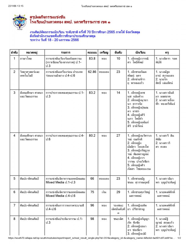 สรุปผลการแข่งขันงานศิลปหัตถกรรมนักเรียน ระดับชาติ ครั้งที่ 70 ปีการศึกษา 2565